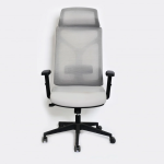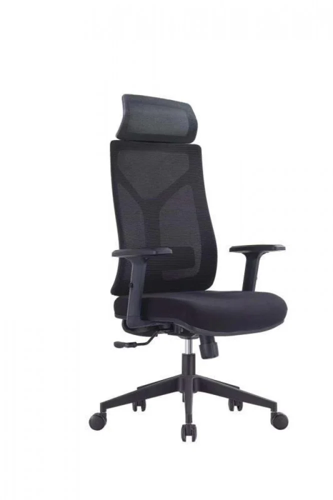 كرسي دوار بظهر طويل من الشبك ومقعدة من الاسفنح عالي الكثافة ليناسب الجلوس الطويل وبأيدي ثنائية الحركة